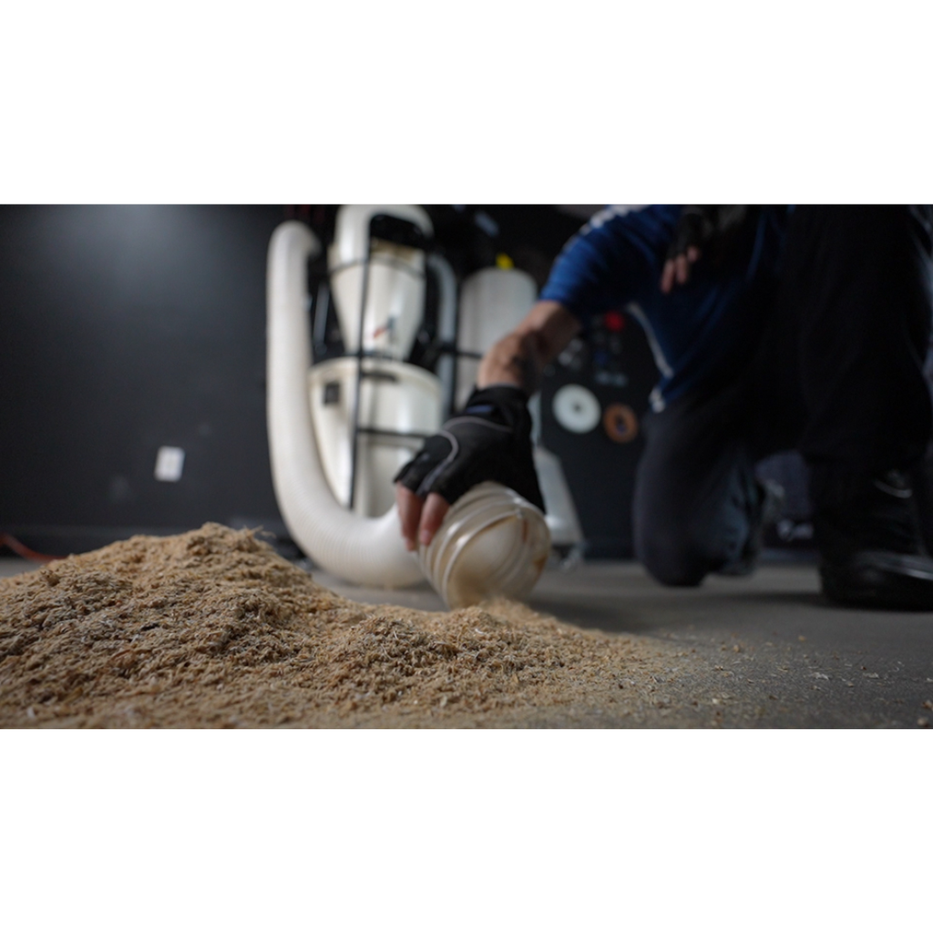 The cyclone creates a vortex that drops heavier chips and dust into the drum before the fine dust ever reaches the filter. That’s the whole point: better separation, less filter loading, and more consistent suction when your shop is cutting all day.